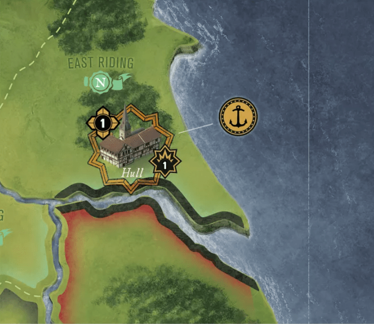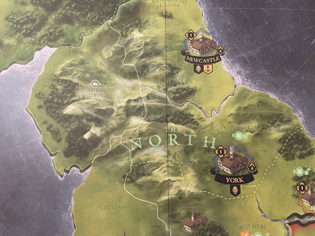 It is important to take note immediately that there are really 3 different areas represented here on the board that are all tied to their allegiance or lack of to one side of the conflict or the other. On the east side of the island are the Parliamentarians (orange) and their holdings as they control the East, which includes Norfolk & Suffolk, Lincolnshire, Cambridgeshire & Huntingdon Shire, Buckinghamshire & Hertfordshire and Essex. This area has a Region boundary that is colored red for easy identification and to separate the 3 areas. You will also notice areas marked with a blue crown icon are loyal to the Royalists, while those marked with an orange mace icon are Loyal to the Parliamentarians.