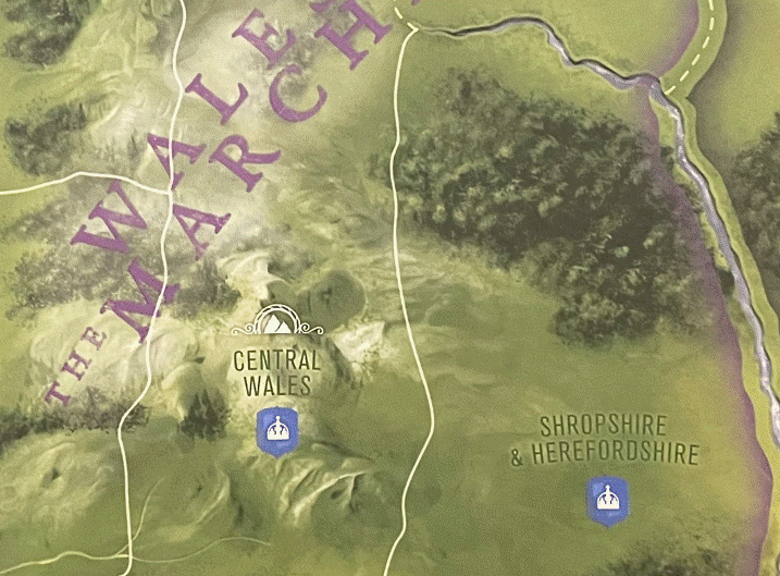 The Royalists (blue) are found in the western part of England and their holdings include Southwest Wales, Central Wales, Northwest Wales, Southeast Wales, Shropshire & Herefordshire and Cheshire. These holdings have a Region boundary that is colored light gray. Each side does have some additional influence in other areas as the starting setup places blocks in certain areas not clearly aligned with either side.