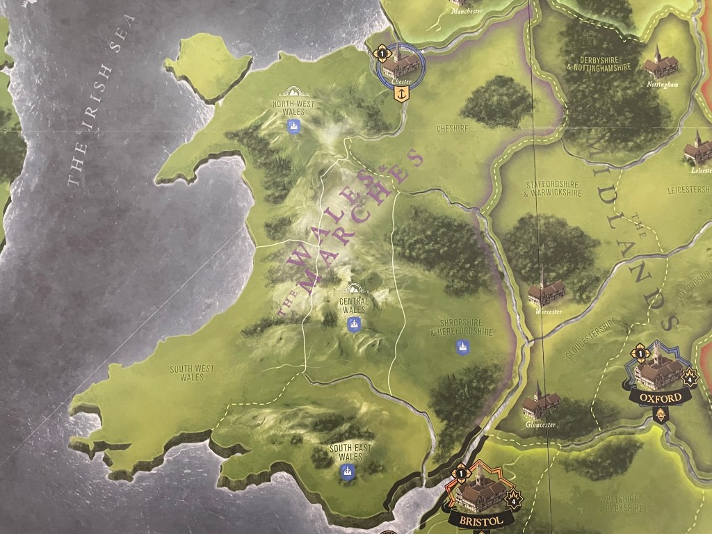 Let’s take a closer look at Bristol. Bristol is a Major City and is fortified and you can tell both by the large black banner and title at the bottom of the city as well as the fortified wall shown around the buildings. If you look at Gloucester just to the north it has no banner and it is classified as a Minor City, the name of the city is smaller and there is no fortification built around the building. The other key with cities is that their allegiance is shown by a color around the outside. In the case of Bristol, the orange tells you that it is loyal to the Parliamentarians. It is very rare to see this kind of detail with cities on a wargame board but I really appreciate the aesthetic that it presents here. It works mainly due to the fact that the board uses area movement but I do like the attention to detail and it really makes the board stand out from other area movement boards we have played on.