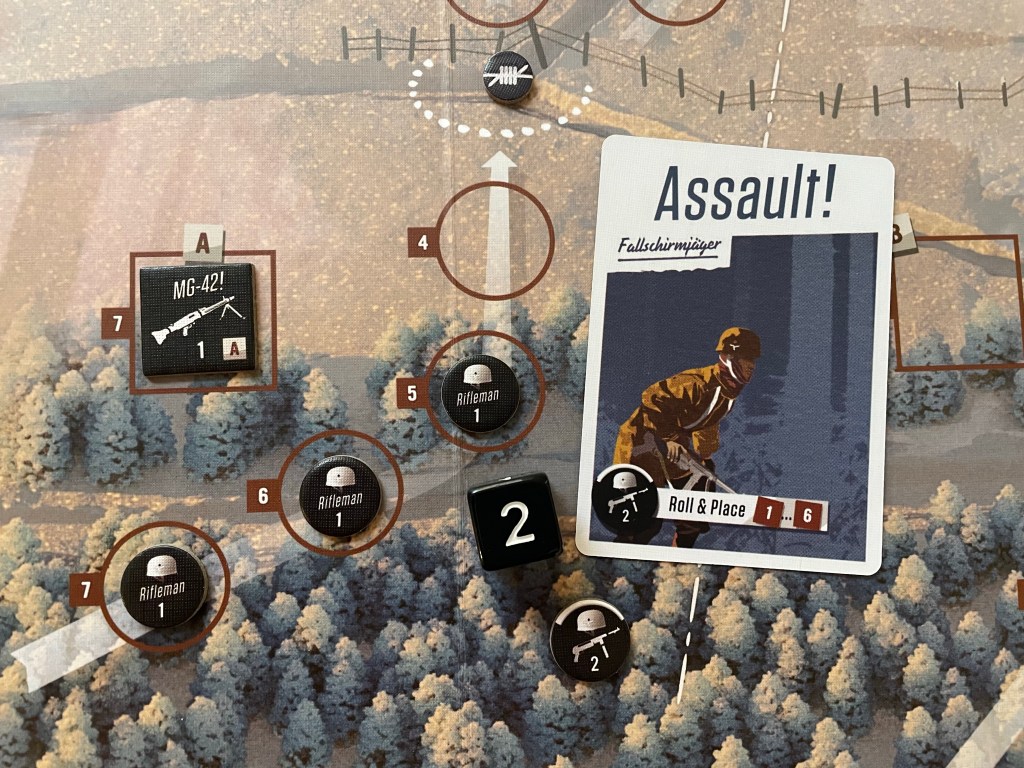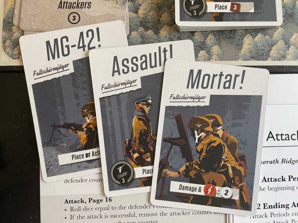 MG-42! – these cards bring out nasty MG-42 counters that are placed in their special boxes adjacent to the Assault Tracks that will fire on a random Defender Combat Position.