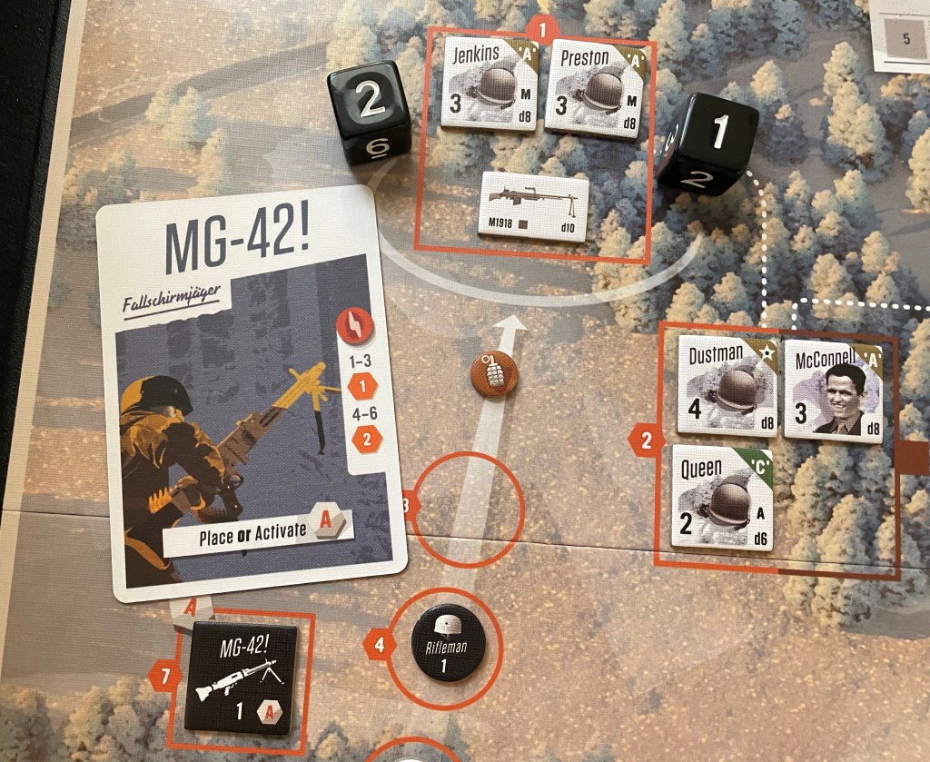 When the MG-42 Position is occupied and the card is drawn it will result in an attack on the defenders. This is done by rolling a six-sided die and comparing the result to the MG-42! Card. The result indicates the defender Combat Position that is attacked. If the Combat Position is unoccupied, there is no effect but if the Combat Position is occupied, then the player will roll one six-sided die for each defender in the Combat Position and compare the result to the defender’s Valor Rating. If the result is equal to or higher than the defender’s Valor Rating, place a Disrupted Token on the defender. If a defender already has a Disrupted Token on it, then the defender becomes a casualty and will be removed from the board and will decrease the Morale Token on the Morale Track by one step.