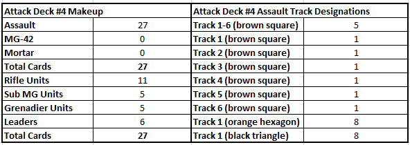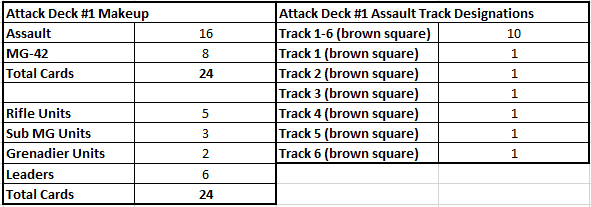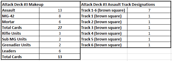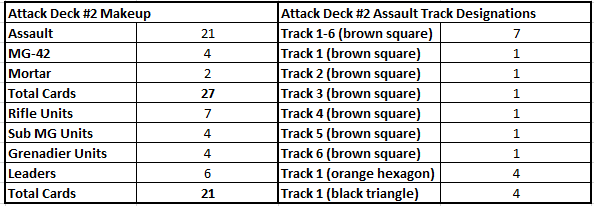 Now that we have looked at the different type of cards, and discussed how they work and what the effects are of each of the three types of cards, I want to take a closer look at the makeup of each of the 4 Attack Period Decks. I want to particularly focus on the number of different Assault! Cards and the units they place but also where they place them. I believe that knowing what Assault Tracks are more likely to get Assault Counters will help you as you plan your defense of Lanzerath Ridge.