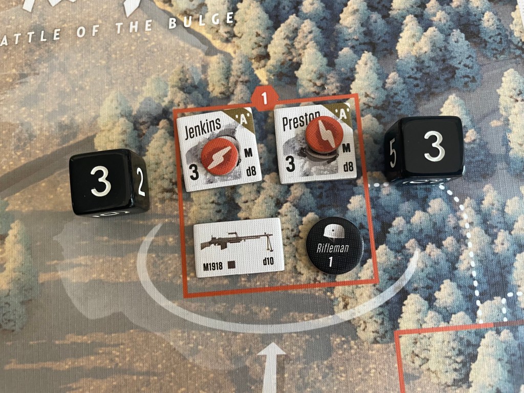 This is done by adding up the total Combat Value of the Assault Counters moving into that position and rolling an equal amount of D6’s. The player will then roll the number of dice equal to the Total Combat Value against each of the defender counters in the position. If at least one of the dice rolled is equal to or higher than the defender’s Valor Rating, this will result in a Disrupted Token being placed on the defender. If a defender already has a Disrupted Token on it, the defender will then become a casualty and will be removed from the game. Also, if an Assault Counter advances into a Grenade Token, this means that the booby trap located there is now resolved and will remove the first Assault Counter that enters that space and the Grenade Token will be returned to the supply.