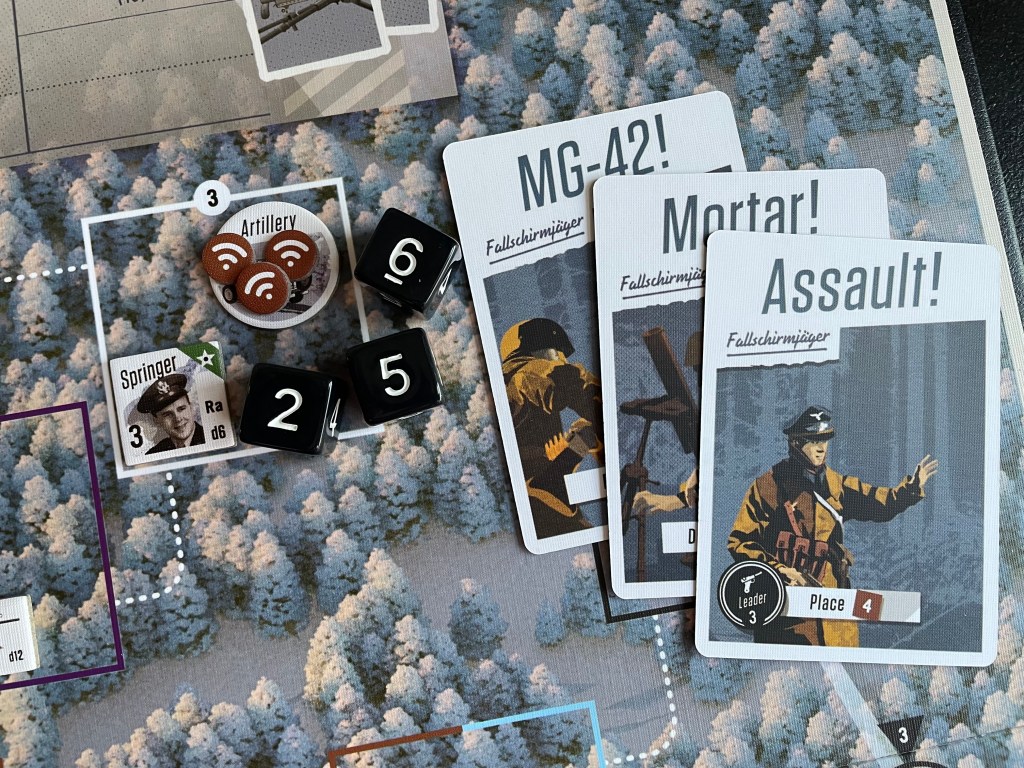 For example, in the picture above, Springer does well rolling a 6, 5 and 2 which enables the player to then take the top 3 cards off of the Assault Deck and remove them from the game. This means that they will not get placed on the Assault Tracks and the Attack Deck will be shortened by these 3 cards. In this example, an MG-42!, Mortar! and Assault! Cards are removed from the game. This could be the difference between life and death for the player and this was a good result.