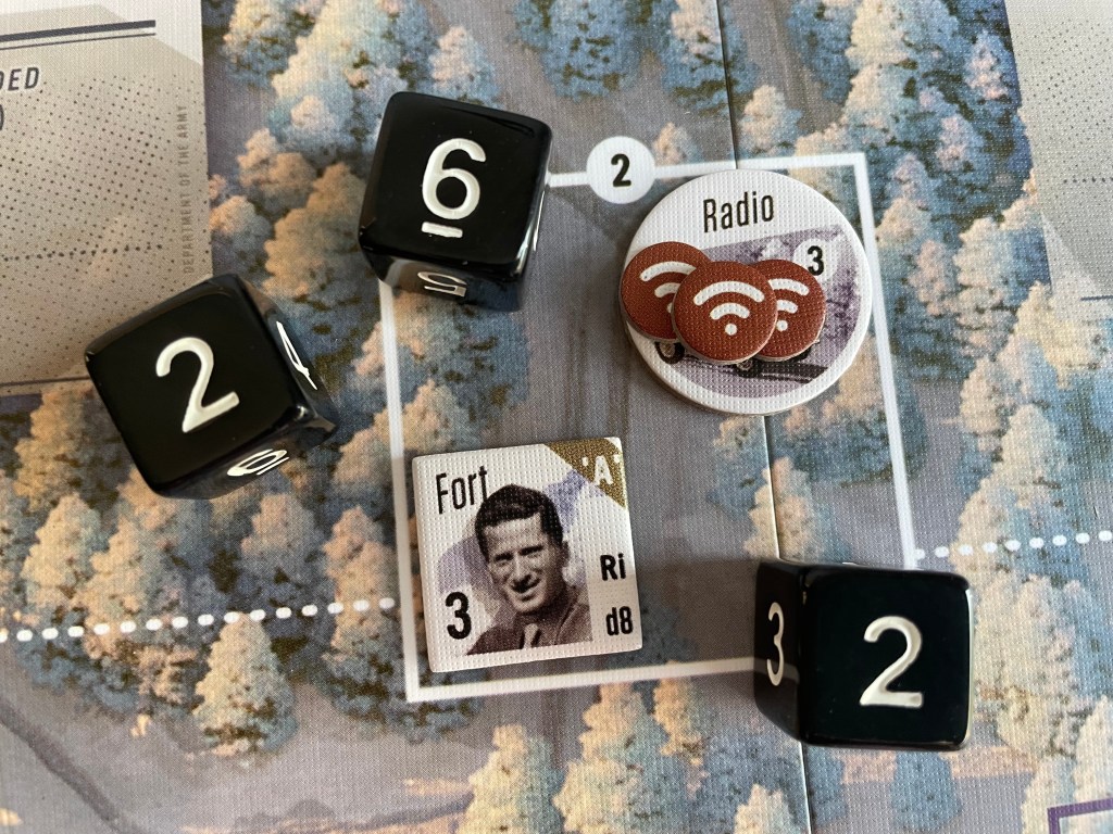 As mentioned, this Radio Intelligence Action takes an investment of a minimum of 5 actions (1 Move Action to move from the Log Cabin to the 2 (white circle) position, 3 Minor Actions to place 3 separate Radio Tokens on the Radio Jeep and then finally a Major Action that will exhaust the defender counter to then attempt to roll 3d6 hoping to obtain at least one 5 or 6). This is a big commitment and can take away needed actions to defend against the Assault Counters moving up the Assault Tracks toward the Defender’s Combat Positions. This is an action that I would recommend caution with, especially at first until the player gets more familiar with the game. You simply cannot afford to commit resources with no return in this game and 5 Actions for no results can be deadly.