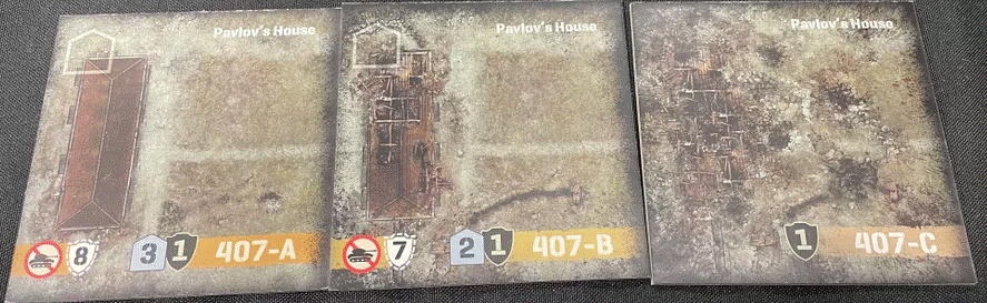 David: The game introduces two new major Terrain Types: Buildings and Fortifications. Buildings provide improved defenses when you are attacked from another tile (and they also prohibit vehicles from entering a tile). But they can be targeted by antitank weapons, demolitions, and bombs. If they are damaged, you replace the tiles with a damaged version of the buildings. In addition, Fortifications are special tiles that provide improved defense to the force that controls the tile.