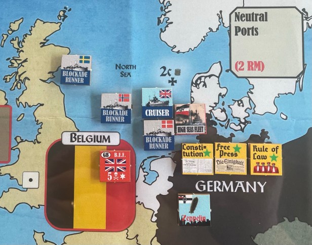 In the above picture, the Central Powers defeat the British Cruiser with the High Seas Fleet and the 3 Blockade Runners placed in seas zones 2b, 3 and 4 bring home a cash haul of 9 Reichsmarks that will be used to take actions and push back the amassing Entente forces in the various staging areas to avoid an Over the Top chit from being placed and prevent the built up forces there attacking into Germany. This process of gaining income is very interesting and unique and it really feels correct as you are trying to do your best to avoid and destroy the British Cruisers so that you have your choice of the best producing sea zones without the fear of Entente intervention.