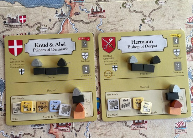 In Nevsky, the map is fairly small but the best routes are not always by land and can be by river and seas as well so you have to have a good selection of Transportation Assets in order to move the needed Provender from your Supply Sources to your troops in the field. In the picture above, you will count 12 different Transportation Assets among the two Lords shown (Knud & Abel, Princes of Denmark and Herman, Bishop of Dorpat). These Assets include a total of 6 Sleds, 2 Carts and 4 Boats or 12 total Transportation Assets. The Carts can be used when the roads are not frozen, during the winter the Sleds come in more handy and then the Boats can allow greater access to certain areas by the sea or rivers. These Assets are won when battles are fought in the field as the loser will sacrifice their assets to the winner so you can collect a good amount of these over the course of the game.