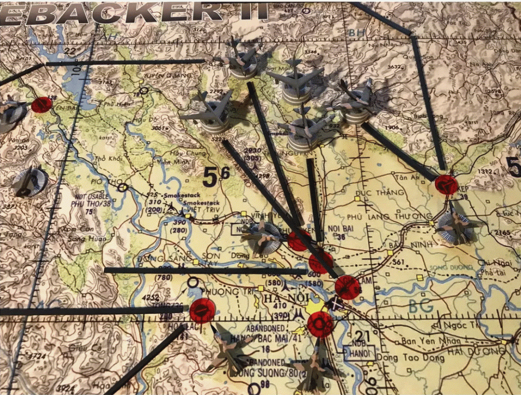 The basic design features a main aviation chart map that includes a number of target boxes, covering the area involved in the historical campaign.  Players use miniature aircraft, SAMs, AAA batteries, chips and counters to simulate the historical raids, one wave at a time.  The NVA player sets up their air defense, then the US player puts together their raid wave plan layouts indicating how many bombers will attack which targets (and routes, altitudes, TOT, etc.).