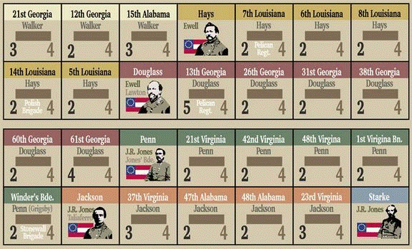 Christopher: Brothers at War uses a chit-pull system. At the beginning of the turn, two Activation Markers for each brigade (plus 2 for each side’s divisional artillery) are placed in an opaque container. Along with the activation markers is one Countdown Marker, which is used to determine when the turn ends. During the activation phase, these markers are drawn, one at a time, and placed on an Activation Track. The brigade indicated on the activation marker is activated:  first the brigade Recovers (all “finished” markers are removed, and disrupted units attempt to rally). Then its Ready units may activate, one at a time or in stacks of 2, spending their movement points to do things like move or assault (spending movement points for each hex entered), fire (2 movement points), change formation (2 movement points), etc…  When a unit has fired, assaulted, or spent its movement points, it’s marked finished, and another unit/stack is activated. When the brigade is finished, the next marker is pulled from the cup and that brigade activates. As activation markers are placed on the track, certain spaces will add additional Countdown Markers to the cup. Once 2 Countdown Markers have been pulled the turn ends.