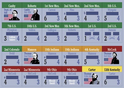Special unit types would be Skirmishers, which have a variety of special functions, primarily screening friendly troops and harassing enemy formations. At Valverde and Mill Springs, I had to develop units representing irregular formations that weren’t part of the brigade structure. These are handled as “independent skirmishers”, which vary in a few key ways from the brigade skirmishers. Artillery units can have very long ranges at this scale, so some of it had be handled as off board units. These guns can target units on the board from as far as 30 hexes away, provided they can trace line of sight. Units on the map can return fire if they have sufficient range.