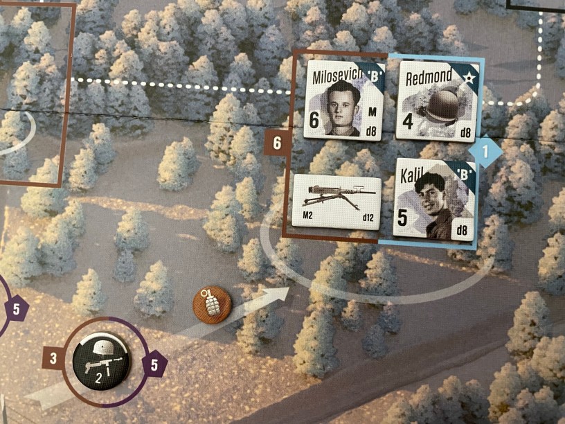 The M2 Machine Gun must be moved as it is really not in a great position to offer much help. If it is left in 1 (purple pentagon) its to hit numbers are very high (5 in Assault Circle 3 on multiple Assault Tracks with it growing to as high as 8 as you move further away) and its Line of Sight is limited to only the 3 branching Assault Tracks that connect to 4, 5 and 6 (brown square). I would encourage players to relocate this MG to the dual 6 (brown square)/1 (blue diamond) Combat Position as it allows for coverage of the brown square and blue diamond Assault Tracks. The best choice for personnel in this position now would then be James from B Squad who is a Machine Gunner with the M Action Designator and moving Redmond into this same position to take advantage of his Inspire Attribute to increase the number of dice rolled with each Attack.