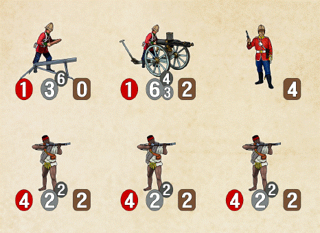 Bill: The combat system is the same other as my other games except that I added Gatling Guns, Rockets, and of course the power of the Martini Henry Rifle that has a range of four hexes. CRT’s are not used as this is a level of complexity not found in the design. I have found that new players struggle with the concept of odds based attacks but understand quickly a to hit number based on Combat Value.