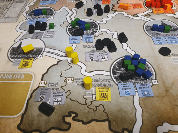 Your broad strategic goal as the Allies is to take control of the most populous cities and provinces, occupy them with both troops and police, and spend resources on reconstruction to build them up towards Allied loyalty. This is easier said than done though! A single underground Werwolf or Edelweiss cell in any space can undo all your expensive work with a single action like terror, so you need to be hunting down guerrillas to allow your reconstruction efforts to take full effect. The Search Action is the usual way to do this and should be done as a high priority to reveal guerrillas in your high population cities and provinces. Reinforcement, Patrols, Air Lifts and Redeployment can all be used to shift forces to where they need to be and ensure strong garrisons in all Allied territory. If you have Allied loyalty and at least 3 cubes in a space, all guerrillas marching into it will be revealed as the populace report on their movements. This can help protect the civilians that have joined you. In the image below from a playtest game, the Allies have built up loyalty plus military and police forces in Stuttgart, Frankfurt, Bonn and Nuremberg, making them fairly safe. There are still hidden Werwolf guerrillas (lying down = underground) in some of these cities though, which will need to be rooted out before they can use terror against the pro-Allied civilians.