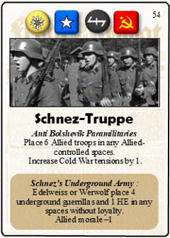 In the game, Schnez and his private army might join the Allies to assist in holding back the Soviet hordes. This is extremely useful for the Allies, who normally pay a cost in morale for bringing on fresh troops as there is political pressure back in the USA to bring the men home. Recruiting local Germans from the Schnez-Truppe avoids this. It does come at a cost though – Cold War tensions will ramp up as the Soviets accuse the Americans of re-arming fascists. On the other hand, these paramilitary groups may side openly with the Werwolf or Edelweiss insurgencies. They would be happy joining either faction – while some had Nazi sympathies they were mainly united by opposition to communism. 4 free guerrillas and a HE token (representing “borrowed” American tanks) is a tremendous boost to either faction. This card is especially useful for Edelweiss as they can use these pieces to seize control of spaces and immediately add to their victory level.