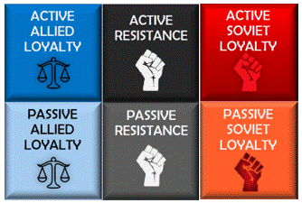 The second part of the Soviet victory condition is total Soviet loyalty. This is the sum total population showing communist sympathies, with “active” loyalty counting for twice as much as “passive” loyalty. While the huge Soviet forces will find it easy to take control of spaces, they will find it harder to build up loyalty – Soviet indoctrination is less efficient than Allied reconstruction and Werwolf or Edelweiss terror. However, building up Soviet loyalty is essential. Not only does it build towards the Soviet victory level, it keeps the population oriented away from Allied loyalty or pro-insurgent resistance and it prevents both Edelweiss and Werwolf from recruiting in the space. To indoctrinate, the Soviets will need both troops and police, so it pays to keep the Red Army and NKVD operating together to provide security. The event deck has many cards that can change Soviet loyalty either up or down, which all players will have reason to play at some point.