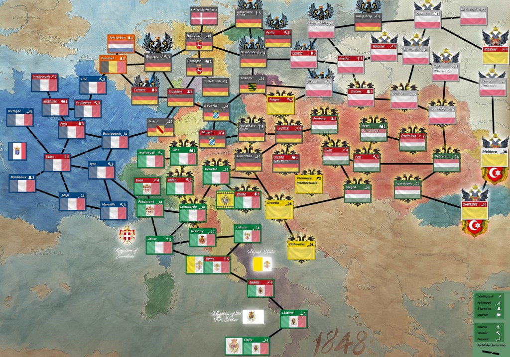 1848: The Springtime of Nations is a 2-player CDG depicting the unprecedented wave of revolutionary activity that swept across Europe in the titular year of 1848. Based on the hit area control system pioneered by GMT’s 1989: Dawn of Freedom and Twilight Struggle, it pits the forces of “the Revolution” against those of the “Counter-Revolution” in a struggle to decide the future of Europe and the world.