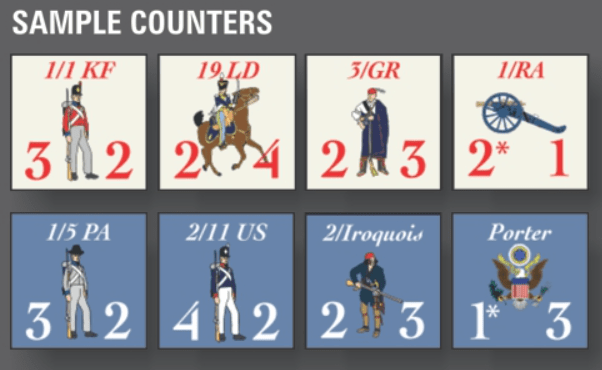 The cardboard game pieces represent the military formations that took part in the original campaign. These playing pieces are referred to as units. Generally, units will have information on the front and reverse.