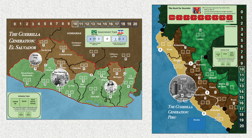 The Guerrilla Generation: Cold War Insurgencies in Latin America is the second COIN Multi-Pack, containing four separate games exploring a series of thematically related insurgencies. Building on the The British Way, this new multipack allows players to explore variations in insurgent groups’ organizational structures, strategies, and relationship with civilians, across four insurgencies in Central and South America between 1968 and 1992. During this part of the Cold War era, Latin America experienced an incredible number of different insurgent groups, many inspired by the Cuban Revolution featured in Cuba Libre, ranging from popular backed rural insurgencies, flexible urban guerrillas, externally sponsored raiders, and brutal ideologically rigid groups. This multipack features a game exemplifying each of these types of insurgencies, to offer players the chance to compare different approaches to rebellion highlighted in the quote by scholar Jeremy Weinstein above. The Guerrilla Generation also offers four longer and more complex individual games than those found in The British Way, as well as an entirely different approach to the linked campaign scenario, which combines two games into a simultaneous side-by-side experience.