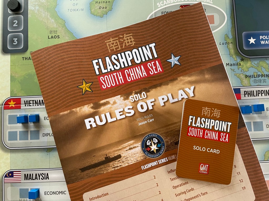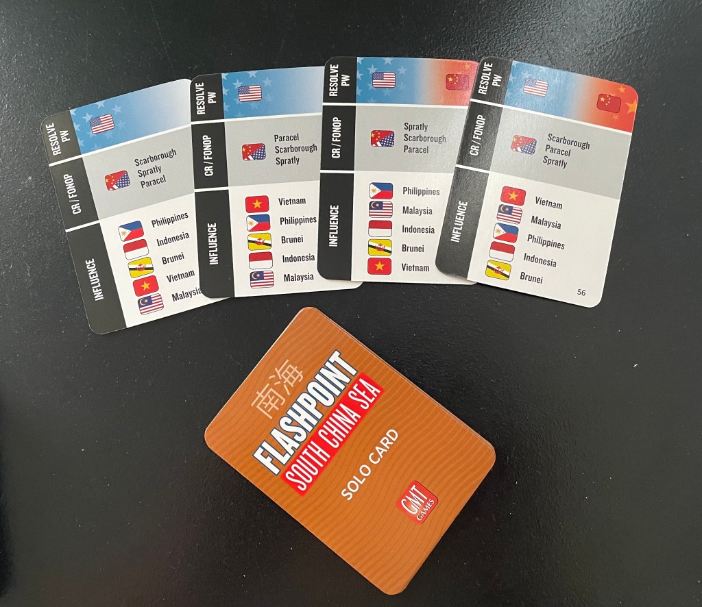 First thing that I wish to say about the solitaire mode for Flashpoint: South China Sea is that it uses the same general rules of play as the 2-player game but the Solo Opponent doesn’t have a hand of Event Cards. They use cards, but only typically draw an Event Card off of the top of the deck or use special Solo Opponent Cards. And, the game is brutal. I have played four times as the United States against the China bot and I am 0-4. I have come close once but it is very challenging. As all good solo games should be.