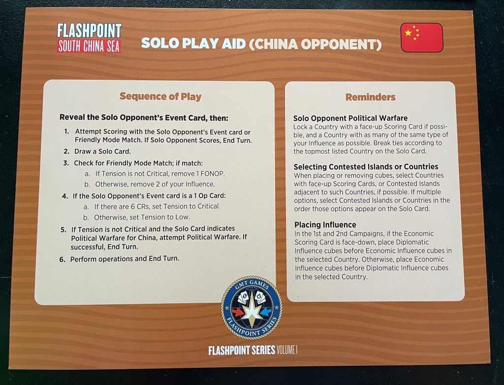 Each of the Solo Cards is divided into three different sections which determine whether the Solo Opponent resolves Political Warfare as a part of their turn, the order in which they place Chinese Reclamation Cubes if playing as the Chinese or Freedom of Navigation Operations Cubes if playing as the United States and the order in which they will place any Influence Cubes on the board. There are eight different Solo Cards and at the beginning of each Campaign, the deck is shuffled. This means that you can see some of the same cards during the Solo Opponent’s turns but there is a good chance some cards will not come out.