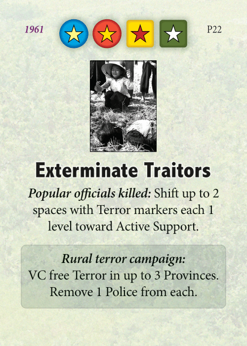 The unshaded effect of this Event allows ARVN or US to reverse VC Terror Operations, by shifting two spaces with Terror markers back towards Active Support, or even to take advantage of Terror markers placed by Law 10/59 to further consolidate their position. The shaded effect allows the VC player to unleash a wave of violent Terror Operations across three Provinces, also removing one Police cube from each affected Province and creating a vacuum of Control in the countryside that they can exploit!