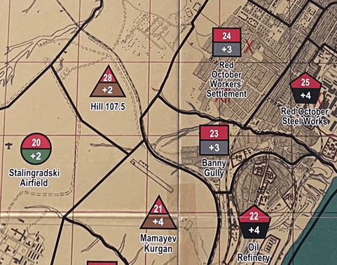 The shape is also important to identify the terrain type of the Area along with the color located in the bottom half of the shape. This is important because the Soviet defender units are setup from a pool of units that are associated with each of the 4 terrain types. The circle shapes are associated with Clear Terrain and are color coded green, the triangle shapes are associated with Elevated Terrain and are color coded brown, the square shapes are associated with Light Urban Terrain and are color coded gray while the pentagon shapes are associated with Heavy Urban Terrain and are color coded black. You will also notice that there is another number with a “+” symbol in front of it in the bottom half of each shape. This is the Area’s Terrain Effects Modifier or TEM and ranges from +1 to +4). The TEM is used when resolving attacks by the player against the Soviet units located in that Area.