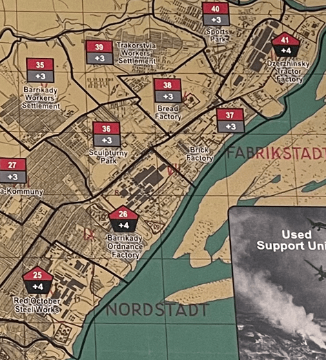 The board is divided into 50 numbered locations which are referred to as Areas. Two Areas are considered to be Adjacent to each other if they share a common boundary which enables units to move directly from one to another. These Areas include both German Army entry Areas as well as Areas that are occupied and defended by the Soviets. One other important distinction about these Areas is the Volga River on the east side of the board and its adjacency to Areas along it. Any of the areas that are adjacent to it give the Guards Units an extra die in combat resolution. The Volga River serves no other purpose but is a very striking line of demarcation for the play area as located to the right of the river are the Turn Track, Morale Track, Record Track and several boxes for units including the Out of Action Box, Available Support Units Box and Used Support Units Box.