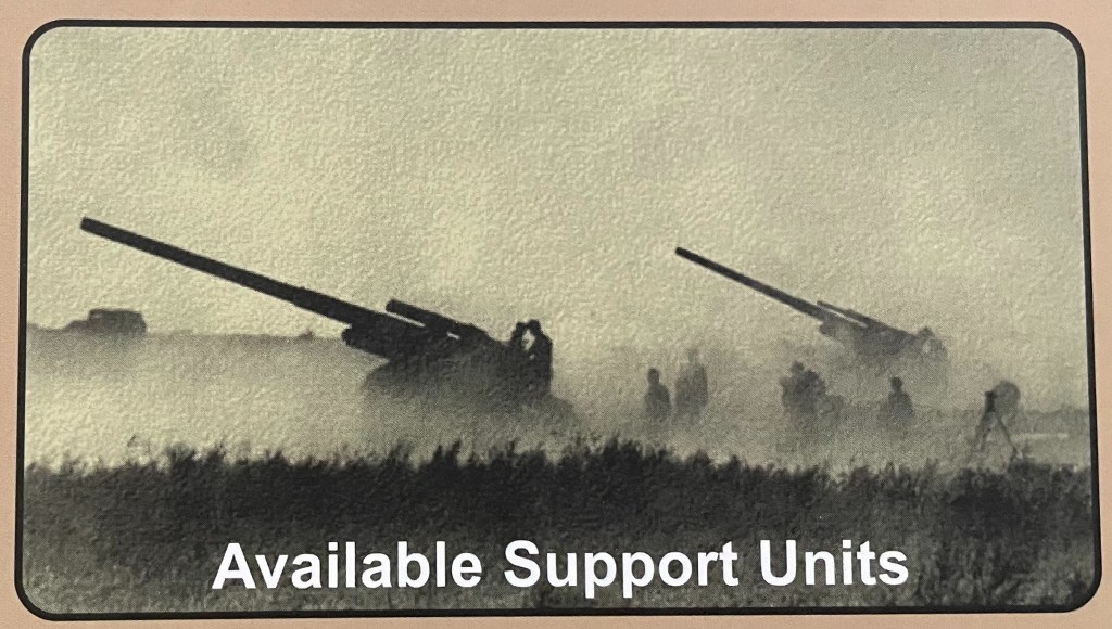 The Available Support Units Box is located under the Out of Action Box and holds Air, Artillery, and Engineer Support Unit markers which have been purchased by the German player during the Supply Phase. The Support Units placed here are available to be used during combat and if they are not used, they stay in the Available Support Unit Box to be used on a later Turn. There is no limit to the number of markers that can be held here subject to the counter limit provided with the game.