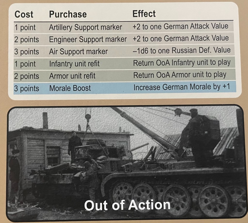 The Out of Action Box is located on the board just under the Turn Track and to the right of the Morale Track and Record Track. The Out of Action Box is a place to hold German units that were selected for loss during the Combat Phase. These units are eligible to be returned to play through the expenditure of Supply Points. The costs for these units to be returned to play are shown in a table located above the Out of Action Box. It will cost 1 Supply Point to reform and return to play an Infantry Unit and 2 Supply Points to refit and return an Armor Unit to play.