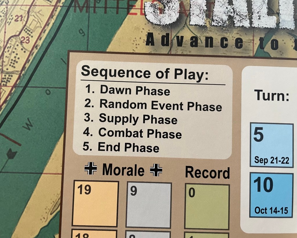 There are also several Tracks and Boxes located on the board that are used during the game to track various aspects such as Supply, current German Morale, the Turn and available and used units. Let’s take a look at each of these administrative aids.