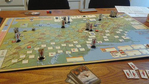There are not a glut of games covering the French & Indian War but there are some really good ones out there including A Few Acres of Snow from Treefrog Games designed by Martin Wallace. A Few Acres of Snow is a 2-player, deck-building game (yes you read that correctly) about the battle for the fate of the North American continent between the French and British and their Indian allies. The deck building sees each player having to collect troops and settler cards in order to control areas to expand into the wilderness and each of these cards will have multiple uses. The players have to choose only one aspect of the card to use when it is played. Each space captured or settled will add another card to the capturing player’s deck thereby making it easier to control the continent. The game is fun, engaging and has some really interesting strategies to it that take into account the different focus of each nation and how they went about fighting this titanic struggle.