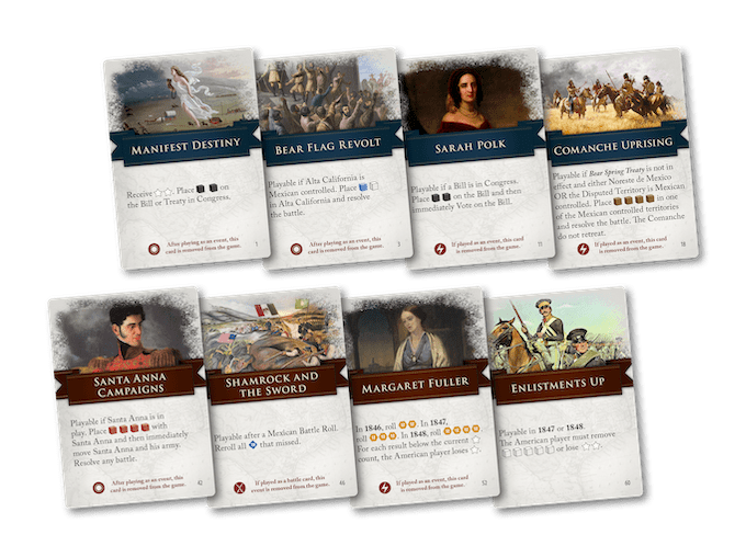 The game uses the two 27-card separate event decks system featured in The Shores of Tripoli, but adds two separate 9-card political decks. The American Political deck features treaties – such as the Oregon Treaty with Great Britain and the Treaty of Guadalupe Hidalgo – and legislation – such as the Ten Regiments Bill and the Wilmot Proviso. The Mexican Political deck features different Presidents – each with their own specific governing benefit – such as Mariano Paredes and Antonio Lopez de Santa Anna. The game also has a 6-card deck with end of Turn events such as receiving reinforcements or the 1846 American midterm elections, and a 30-card “El Robot” deck for solitaire play.
