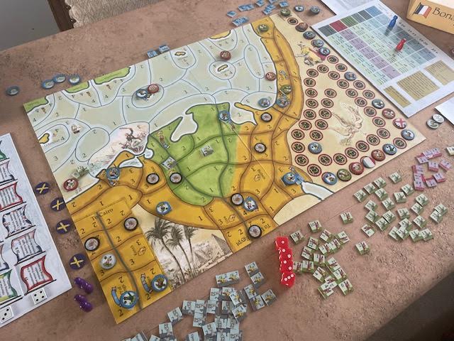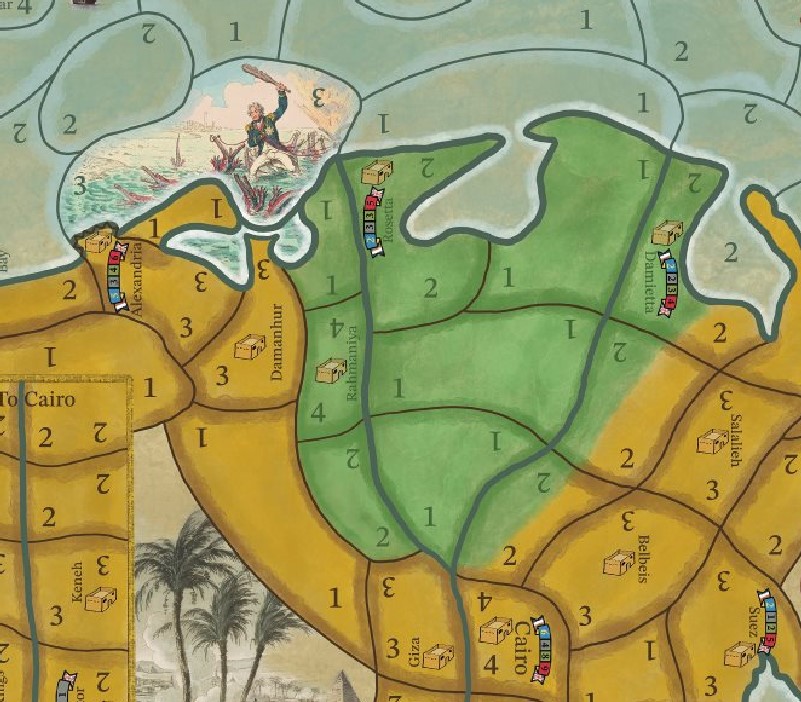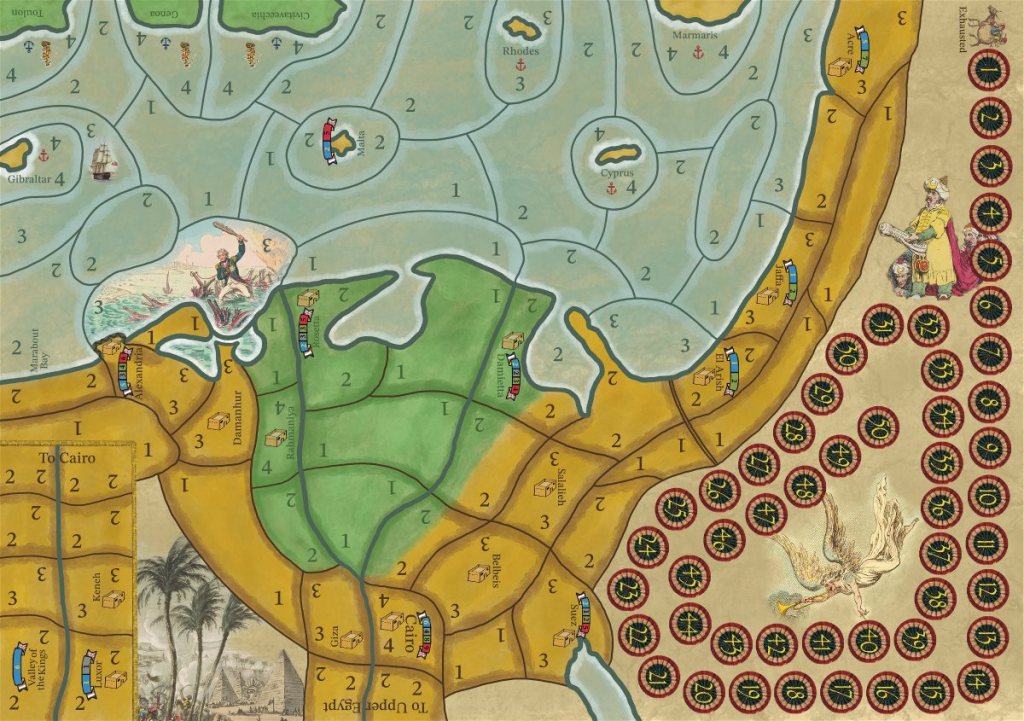 Andrew: The Map covers a distorted and abstracted area of Egypt, Syria, and the Mediterranean Sea. All the art in the game is by contemporary political satirical cartoonists, James Gillray, Isaac Cruikshank and George Cruikshank.