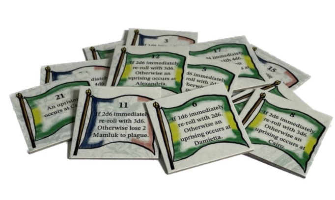 Andrew: The units in the game are Infantry, which is the standard combat unit for all sides. Cavalry, the Mamluk’s and Ottomans have plenty of these, though the French arrive with none and have to mount their cavalry with locally obtained horses through the Event Clock. The British have no Cavalry. The differences with Cavalry units are that they count double in combats, though following the first assault round of a siege, they no longer contribute to the siege. Artillery units count as triple in combats and sieges.