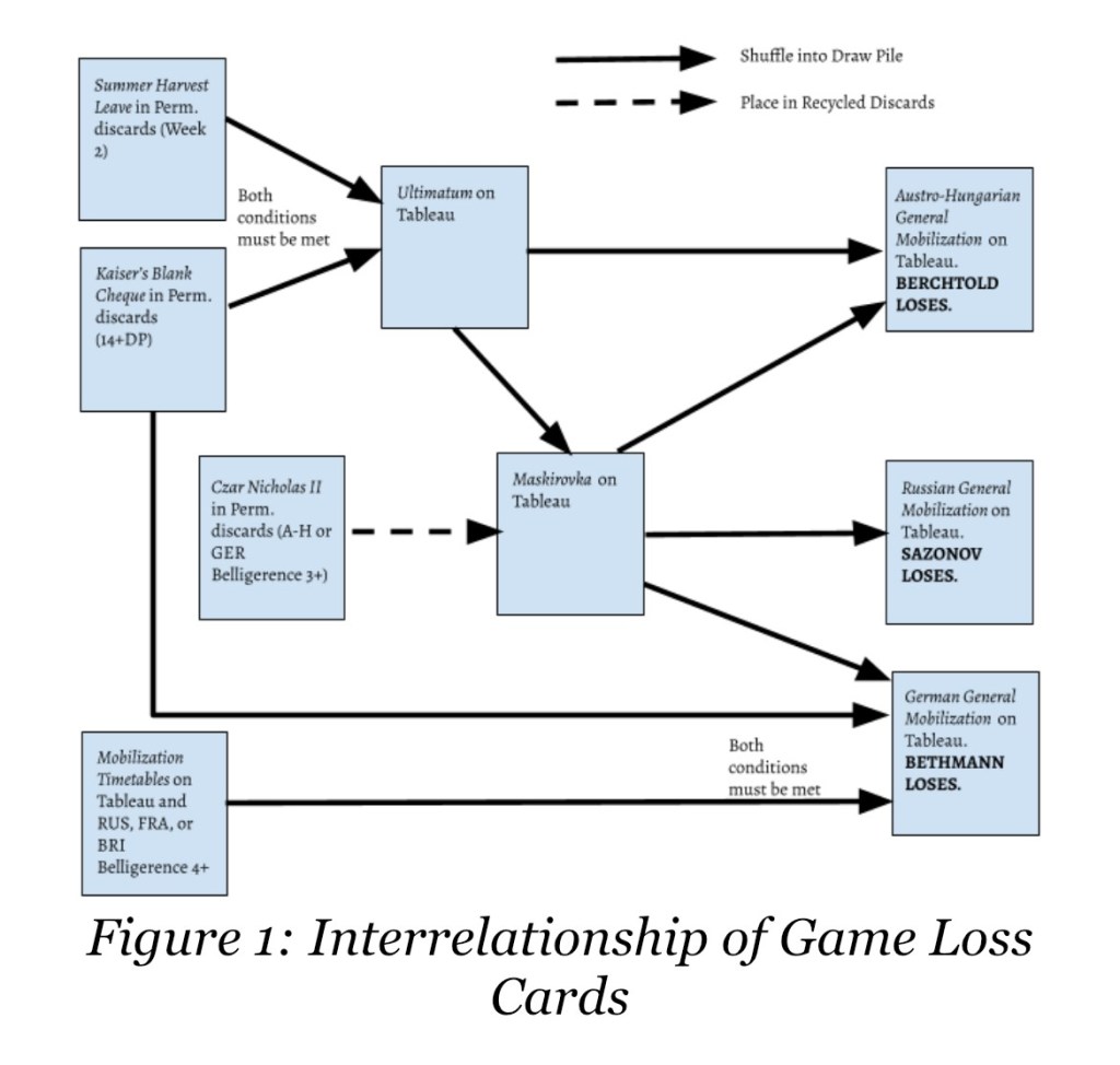In the case of Austria-Hungary, Russia, and Germany, it’s also possible to lose by playing cards to your tableau that compel you to mobilize of your own nation’s volition – it depends how many risks you decide to take, and how many risks everyone else is prepared to take around you, which has an impact on your own deck. Think of it this way – the Austro-Hungarian ultimatum to Serbia provoked the Russian partial mobilization, which in turn brought Germany closer to mobilizing, and so on. There’s a web of interconnected causal dependencies between the three most overtly aggressive nations in the crisis, which we can be represented through a sub-system flow chart: