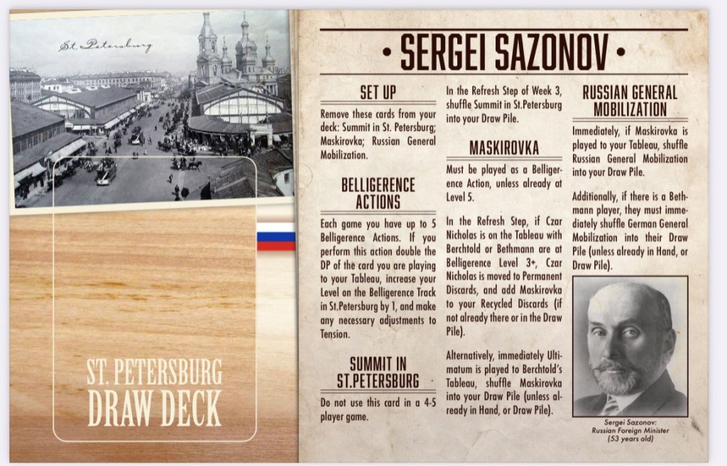 With Berchtold’s deck you also have some options to take more or fewer risks. If you play the Ultimatum to Serbia early this is worth more Prestige Points than if you play it later – but the earlier you play it the harder it is to stop a General Mobilization from happening – and if that card comes out you will lose.