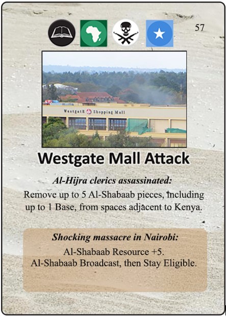 To conclude with those examples, the “Westgate Mall Attack” card is one that carries significant weight. This event card references the tragic 2013 terrorist attack by Al-Shabaab that took 67 lives in Nairobi, Kenya. This is an instance where we tackle the difficult question of why insurgent organizations with primarily domestic agendas resort to external attacks, often for propaganda purposes. The inclusion of this card underscores the reality that Al-Shabaab has had the capacity to strike terror into countries participating in counter-insurgency efforts, while keeping momentum on the front lines in Somalia. The card also has unique gameplay implications. Certain Event Cards, like the Westgate Mall Attack, permit the executing faction to remain eligible for further actions on the next card. This can potentially trigger a chain of impactful effects, a design approach I’ve drawn from the brains behind the Irregular Conflicts Series Volume One Vijayanagara.