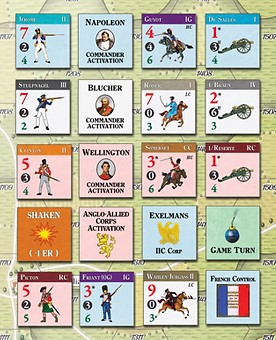 Vive L’Empereur is a hex-and-counter war game that uses a chit-pull system to generate random force activations for both sides. The Anglo-Allied and Prussian forces (the forces of the solitaire side) move and conduct combat using random instructions from the game’s Activation Table.