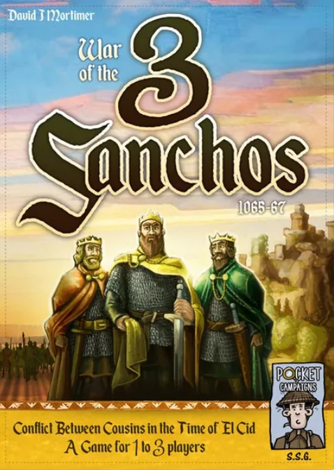 In War of the 3 Sanchos 1065-67, the fourth game in the Pocket Campaigns series, you are one of three King Sanchos, fighting for control of castles and towers across Castilla, Navarra, and Aragón. The game is designed for 1-3 players.