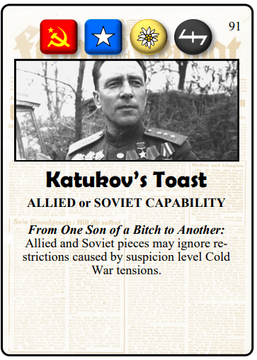 So, this card is actually hugely beneficial, especially if played early in the game so that the capability will remain in effect longer. The Soviet player may be more inclined to play this card, as they are more likely to be entering Allied territory than the other way around. The ability to move past Allied troop or police cubes can allow the Soviets to reach deep into the occupation zones of their Cold War rivals and grab cities or provinces – all under the pretext of helping their American friends hunt down fascist scum!