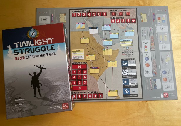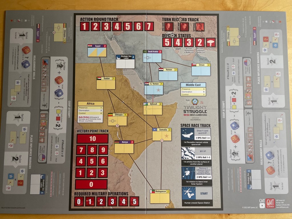 We all love Twilight Struggle….and if you say you don’t, you really do but just want to be different or are a contrarian! The game is phenomenal and has done very well for GMT Games with 8 Printings as well as the Turn Zero Expansion and now a series of smaller geographically focused spin off games starting with Twilight Struggle: Red Sea – Conflict in the Horn of Africa. Twilight Struggle: Red Sea deals with just two regions located in the Horn of Africa including Africa and the Middle East. The game uses the familiar Twilight Struggle formula of Cards with both Events and Operations Points that can be used by players to perform Coups, do Realignment Rolls or place Influence in an effort to gain control of the most Countries in the Regions to score Victory Points and win the game. The game is fast, furious and only lasts 2 hands of cards (unless you choose to play the special 3 Turn variant) so there isn’t a lot of time to mess around and players must be focused on what they are trying to accomplish. The best thing about the game is that it plays in 45 minutes as compared to 3-4 hours for Twilight Struggle.
