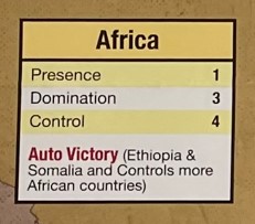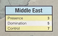 The Regions score a bit differently but also use the same 3 categories as in Twilight Struggle including Presence, Domination and Control. You will notice from the pictures above that Africa scores 1 VP for Presence, 3 VP for Domination or 4 VP for Control in the 3 Scoring Categories while the Middle East Scores 3, 5 and 7 VP respectively. This difference is key and must be remembered by players.