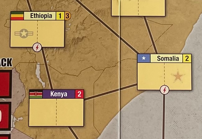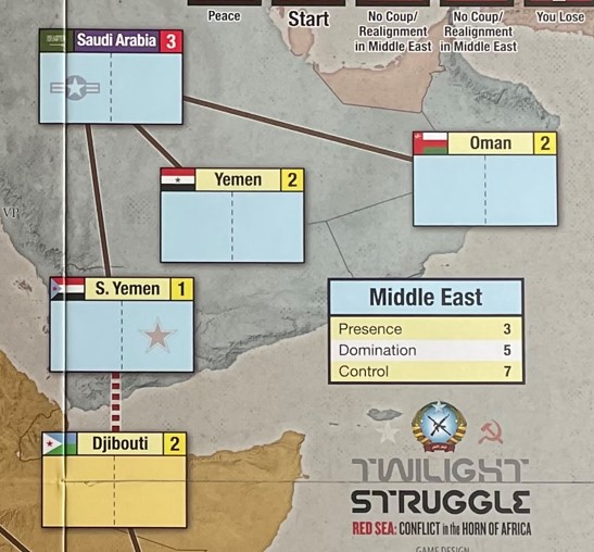 You will also notice that there area 2 different types of connecting lines found on the board, including brown and red lines. Brown lines connect Countries within a Region while the lone red dashed line connects Countries located in different Regions such as with S. Yemen and Djibouti. A Country is considered adjacent to all other countries to which it is connected. This concept is important for various functions in the game such as Coup and Realignment Rolls and the placing of Influence.