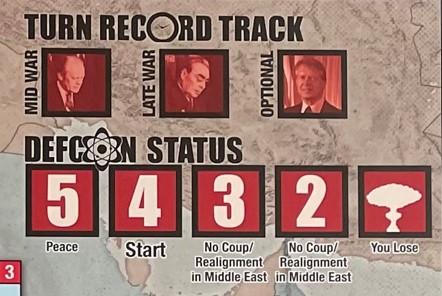 Above the DEFCON Status Track is the Turn Record Track which simply tracks what round of the game the players are in. The start of the game is in the Mid War and then during Turn 2 it enters the Late War. There is an optional rule where players can play 3 hands, rather than the normal game of just 2 hands of cards. This is marked with Optional.
