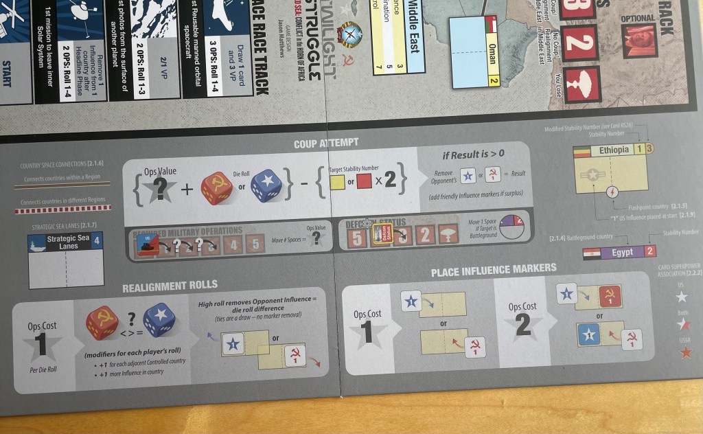 One new addition to the game was the inclusion of Player Aid Sections found on the board for easy reference. These are found on each side of the board for easy reference and give a step by step process of how to do Coup Attempts, Realignment Rolls and how to place Influence on the board. Very well done graphically and we found these very helpful to remind us of the rules for these important Operations.