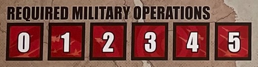 Remembering that this game is a simulation of the events of the Cold War, players are required to perform various clandestine and some overt Military Operations each turn to show strength and effect the World Order or be penalized Victory Points. The Required Military Operations Track is a reminder of where players sit with this aspect during each Turn. The number of Required Military Operations is equal to the current DEFCON Status. If players carry out insufficient Military Operations at the end of a Turn, their opponent will gain 1 VP per unplayed Military Operations point. If both players are penalized Victory Points, the net total should be implemented on the Victory Point Track. Coup Attempts and War Events will count as Military Operations while also possibly reducing the DEFCON Status while Realignment Rolls and free Coup Attempts granted by Events do not.