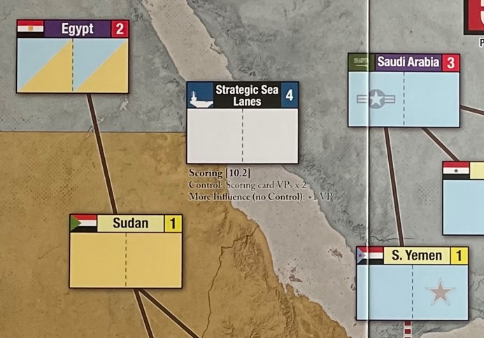 The Game Board for Twilight Struggle: Red Sea – Conflict in the Horn of Africa is much smaller than the board used for Twilight Struggle as it only focuses on two Regions including reduced portions of both Africa and the Middle East and contains a total of 11 Countries and one new Location Type in the Strategic Sea Lanes Box. Africa contains just 7 Countries while the Middle East contains only 5 Countries. As you can see, Egypt is included as a part of both Regions as shown by each Influence Box being half light blue and half tan. When each of the Regions score during the game, Egypt is counted in both Regions.