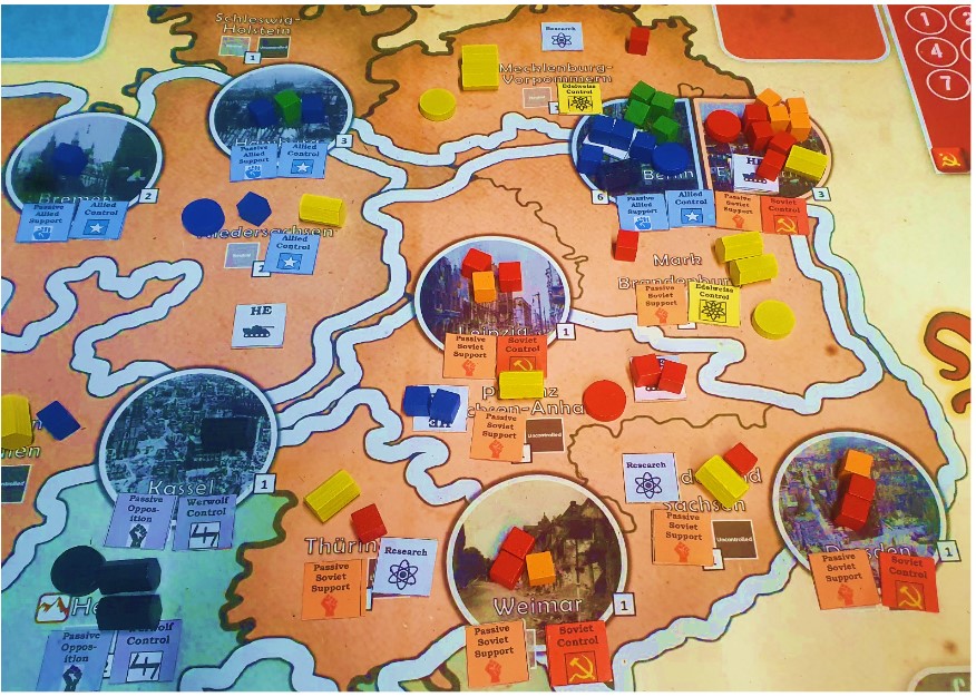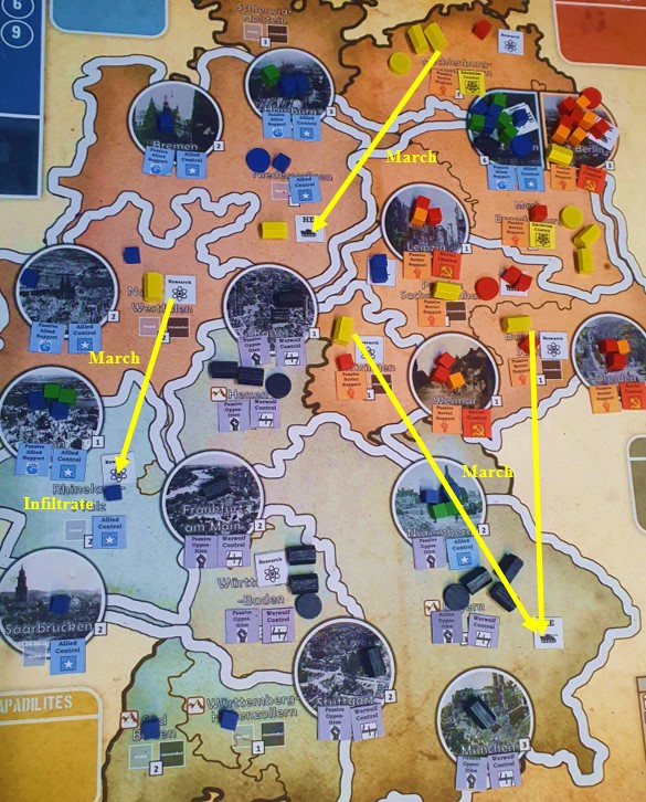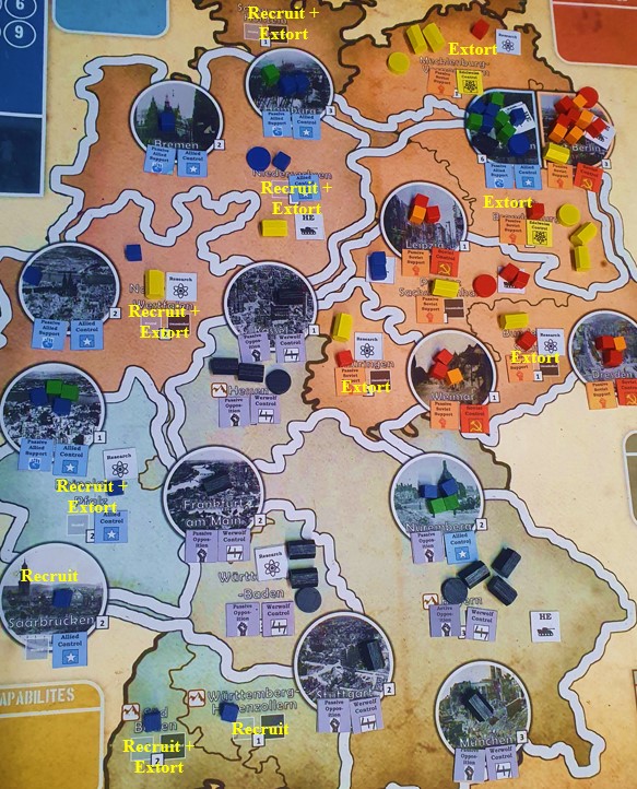 –Terror + False Flag: This opening is very situational and specific to the people you are playing with. IF the Soviets are commanded by a very aggressive player who you KNOW will be targeting you straight away, this is a way to do some real damage to their victory points as well as opening up more spaces for recruitment and slowing down their momentum. Use terror in Mecklenburg, Brandenburg, East Berlin, Thüringen and Bundesland-Sachsen. You can also seize the research in these spaces. This move will cost all of your starting resources but reduces Soviet victory points by 8 (!), grabs 3 research and opens up 5 new spaces in East Germany to Recruit in on later turns. To slow down the Soviets even more, use a False Flag Attack (perhaps killing one of the Troops who could threaten to take research from you). With Cold War Tensions at 2 before the Russkies even move, they are prevented from simply sifting through Allied lines and will be stopped as soon as they hit Nuremberg or West Berlin. Of course, you have made a real enemy of the Soviets right off the bat and they will come after you with a series of assaults to take research and retake control of their territory. That’s why you only do this if you know Stalin is coming after you anyway…