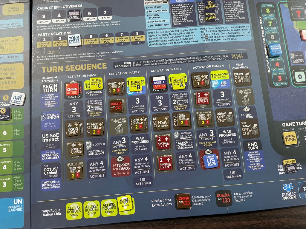 And then there are the contents of the game including 2 game boards; a 22″ x 34″ mounted game board and an additional slightly smaller 22″ x 17″ mounted game board. These boards laid out together filled our gaming table and there was very little room left for anything on the tabletop. There are also a lot of cards, 180 of them, which are called Cascading Event Cards and are really the genesis for trouble for your presidency. 500+ counters and markers spread across 5 total counter sheets that you have to keep straight and have within ready reach as things change rapidly. Then, there are multiple rulebooks, source books, chart books, etc. including a “How to Play” rulebook, “How to Play a Turn” FlipBook, a Scenario Book, World Chart Book, Domestic Chart Book, 2 Peer Competitor Action Books for Russia and China and 6 total player aid cards.